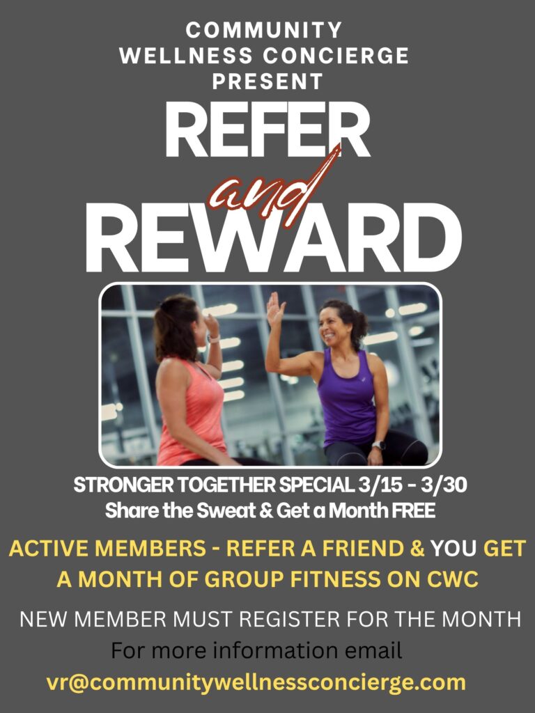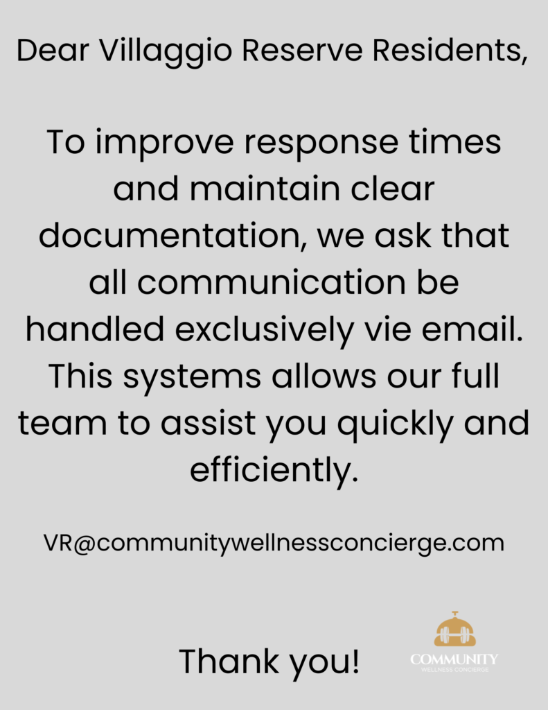 Community Wellness Concierge (CWC) is Villaggio Reserve’s new fitness services provider. Among their services: