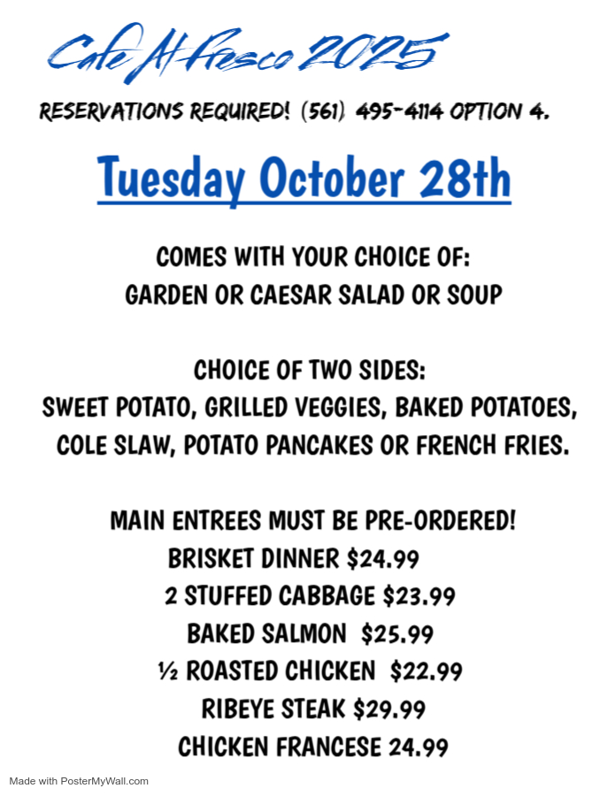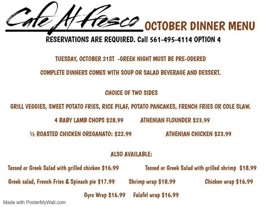 RESERVATIONS ARE REQUIRED FOR DINNERS. Reservations may be made ahead of time during regular business hours ONLY in person at the cafe or over the phone by calling 561-495-4114 OPTION 4.